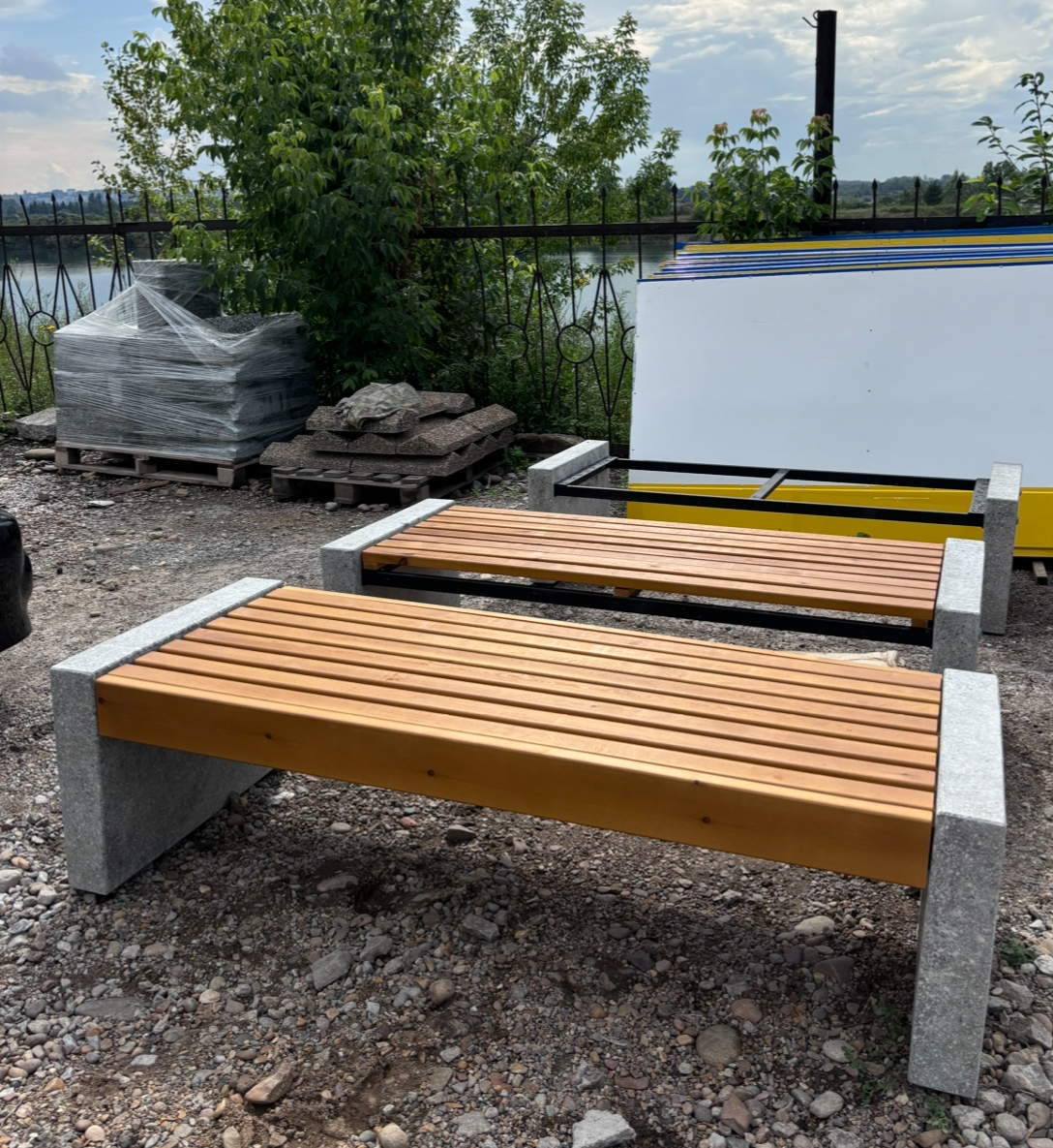Скамья Классик Размер опоры бетонной длина 650 мм., ширина 100 мм., высота 450 мм., Скамья изготовлена из металлического каркаса профильная труба 20/40/2 мм., окраска порошок, доска из хвойных парод 60/30 мм. Общий размер длина 1700 мм., ширина 650 мм., высота 450 мм. вес 140 кг.