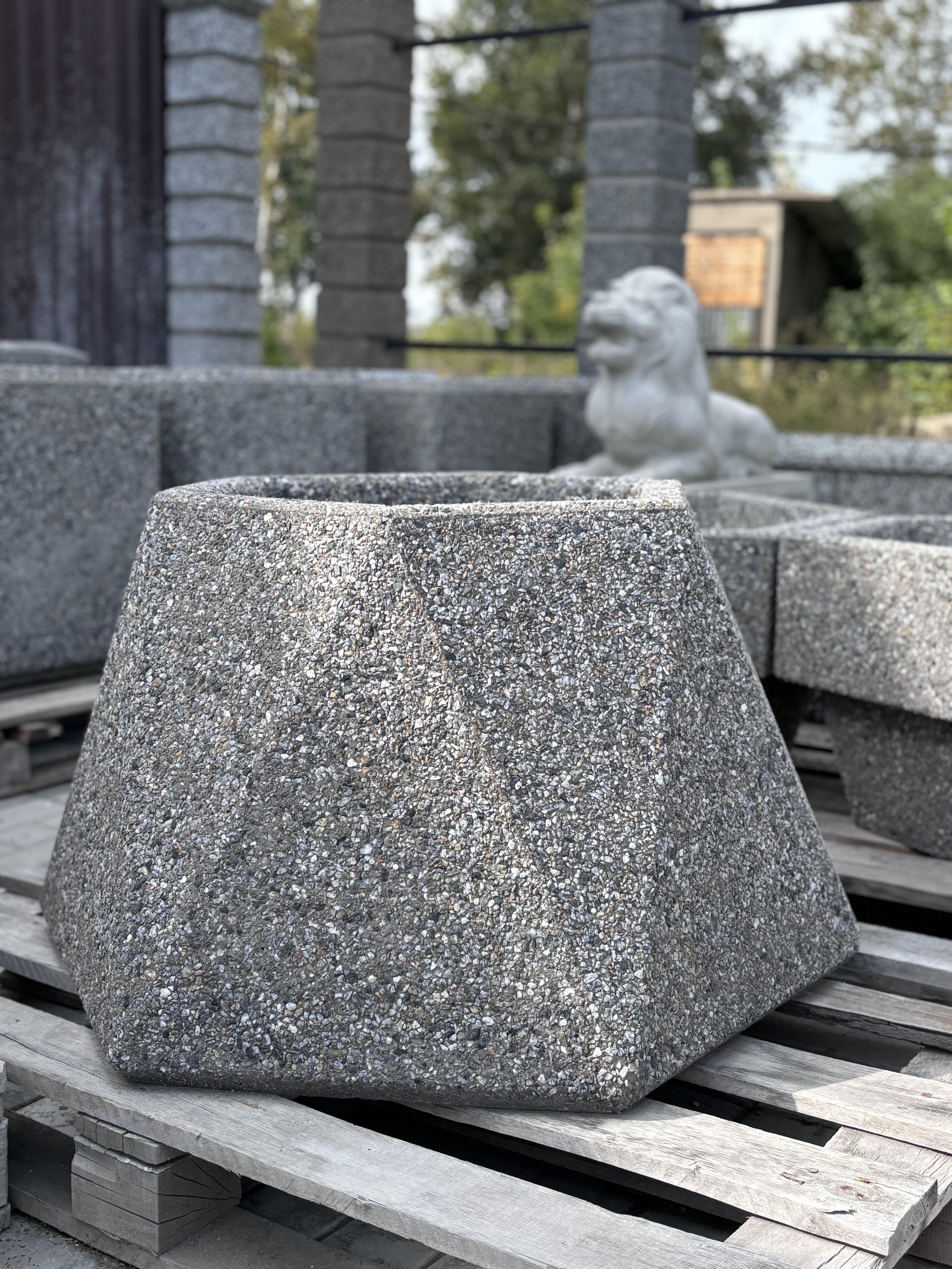 Вазон бетонный Виктория Размер по низу: длина 900 мм., ширина 900 мм. Размер по верху: длина 600 мм., ширина 600 мм. Высота 400 мм. Вес изделия 250 кг.